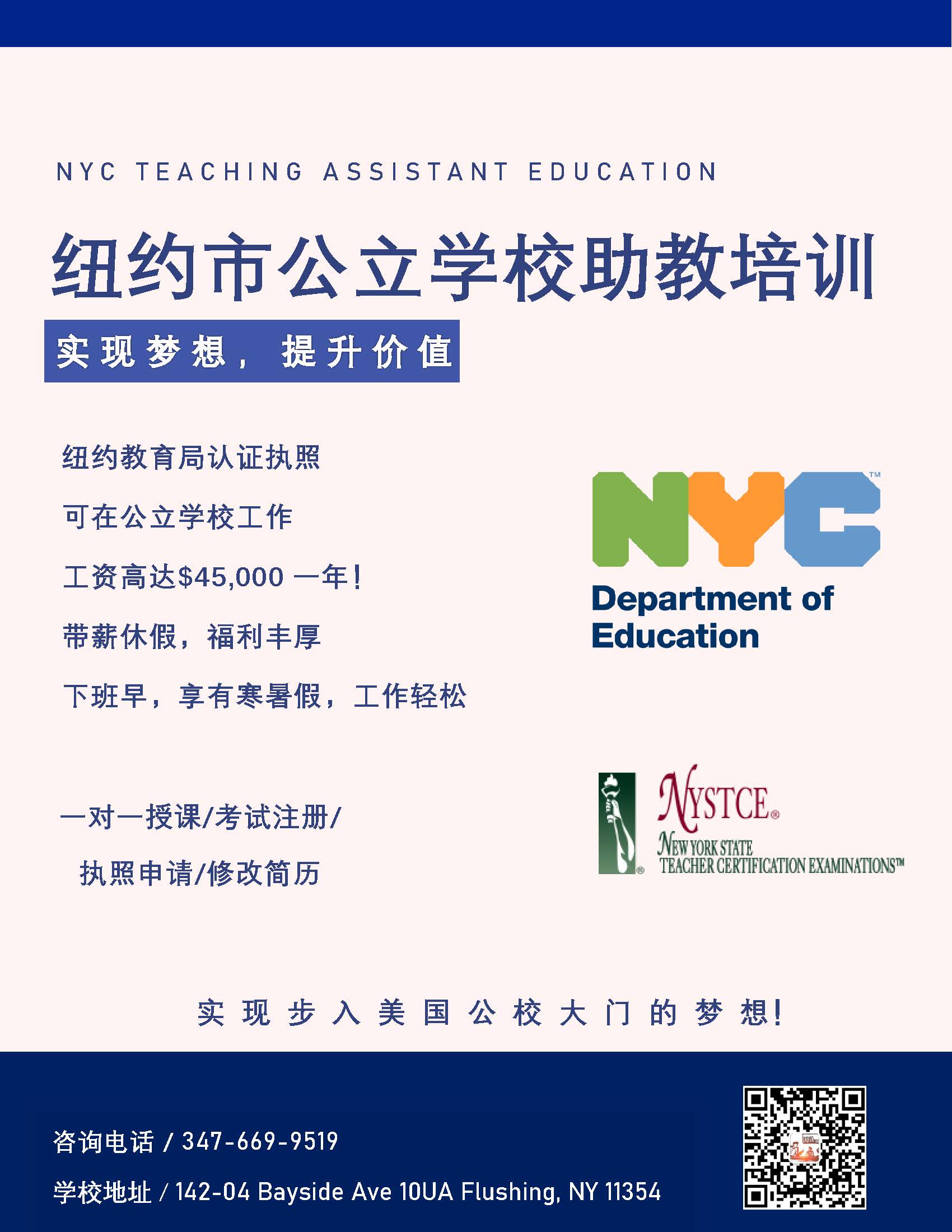 纽约市公立学校助教是一个可高达$45k-$60k一年的工作。如果你能拿到助教执照,你就能步入公立学校工作。英文不好,不知道怎么考取执照,我们都会一步步指导。 纽约市公立学校助教工作介绍: 1. 主要协助老师上课 2. 下班早,每天2:20下班 3. 工作轻松 4. 带薪休假 5. 退休金保障 6. 医疗保险 如何成为一名公立学校助教老师 1. 需基本英语基础 2. 需合法身份 3. 需本地或外地高中毕业证 4. 通过NYSATAS考试 我们会协助您如何通过考试,包括通过考试后一系列的流程,如何申请执照等等。 我们在法拉盛142-04Bayside Ave 10UA Flushing, NY 11354 (Professional Building内) 咨询电话:347-669-9519(Abby) 课程介绍: 来办公室咨询,了解个人情况,安排上课时间,模拟考准备,注册考试,协助申请执照。 秋季开班,速度报名! 快速班:10节课,1个半月 (适合英文基础良好) 基础班:15节课,3个月 (适合有英文基础) 金牌班:20节课,5个月 (适合英文基础不好)