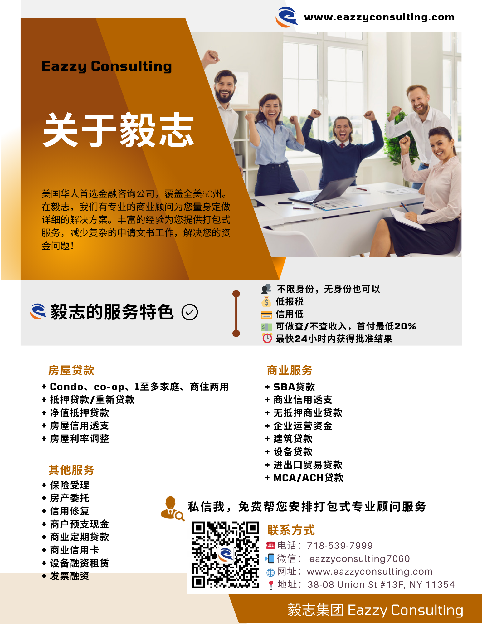 无论您有任何想法或疑虑,我们都欢迎并为您提供免费的咨询服务,以下为我们的联系方式: 电话:718-539-7999 微信:eazzyconsulting7060 地址:38-08 Union St, #13F, Flushing, NY 11354