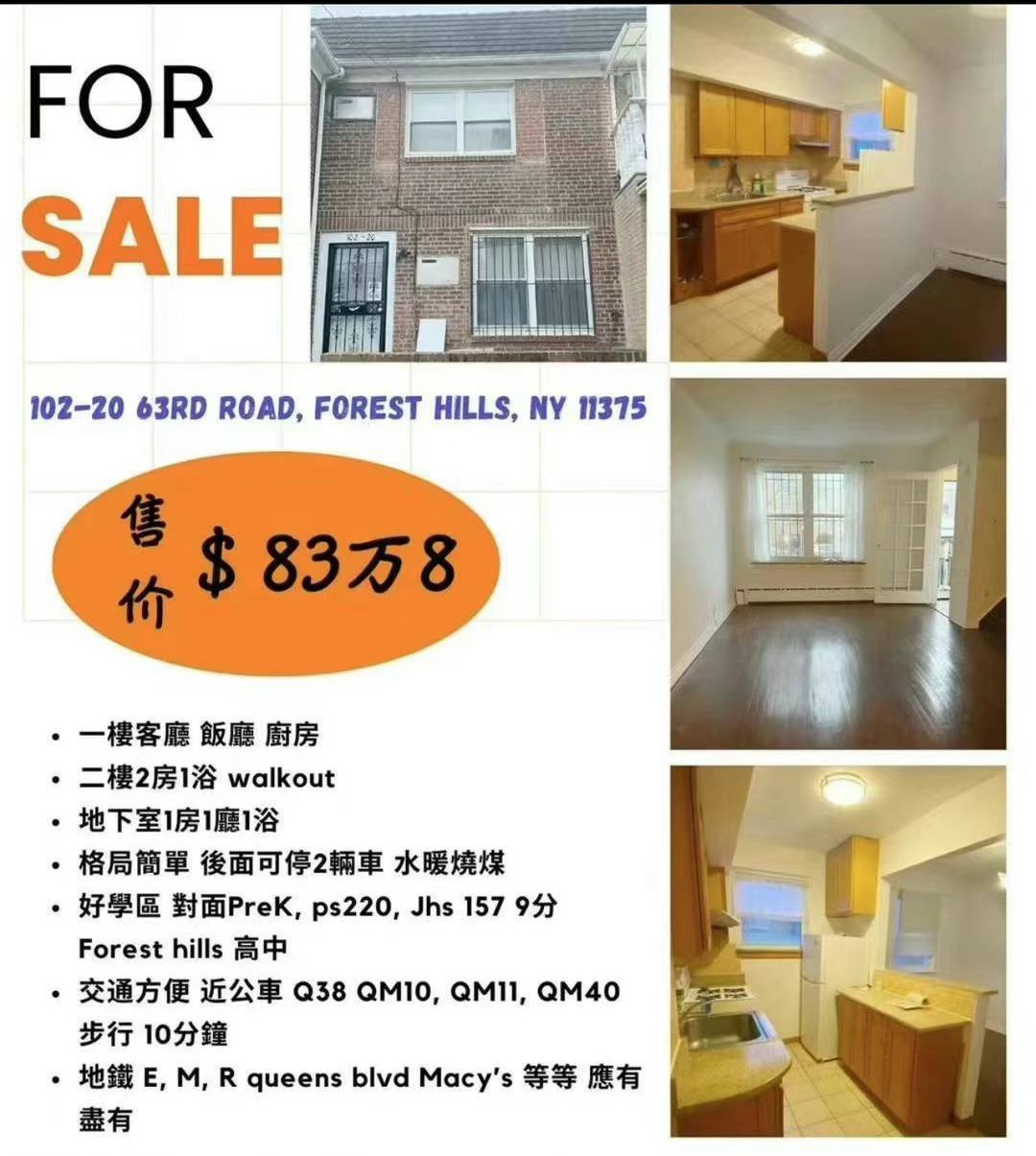 102-20 63rd 新上市 好價錢 Forest Hills 中心 一家庭 2房2浴1300呎 地稅6778