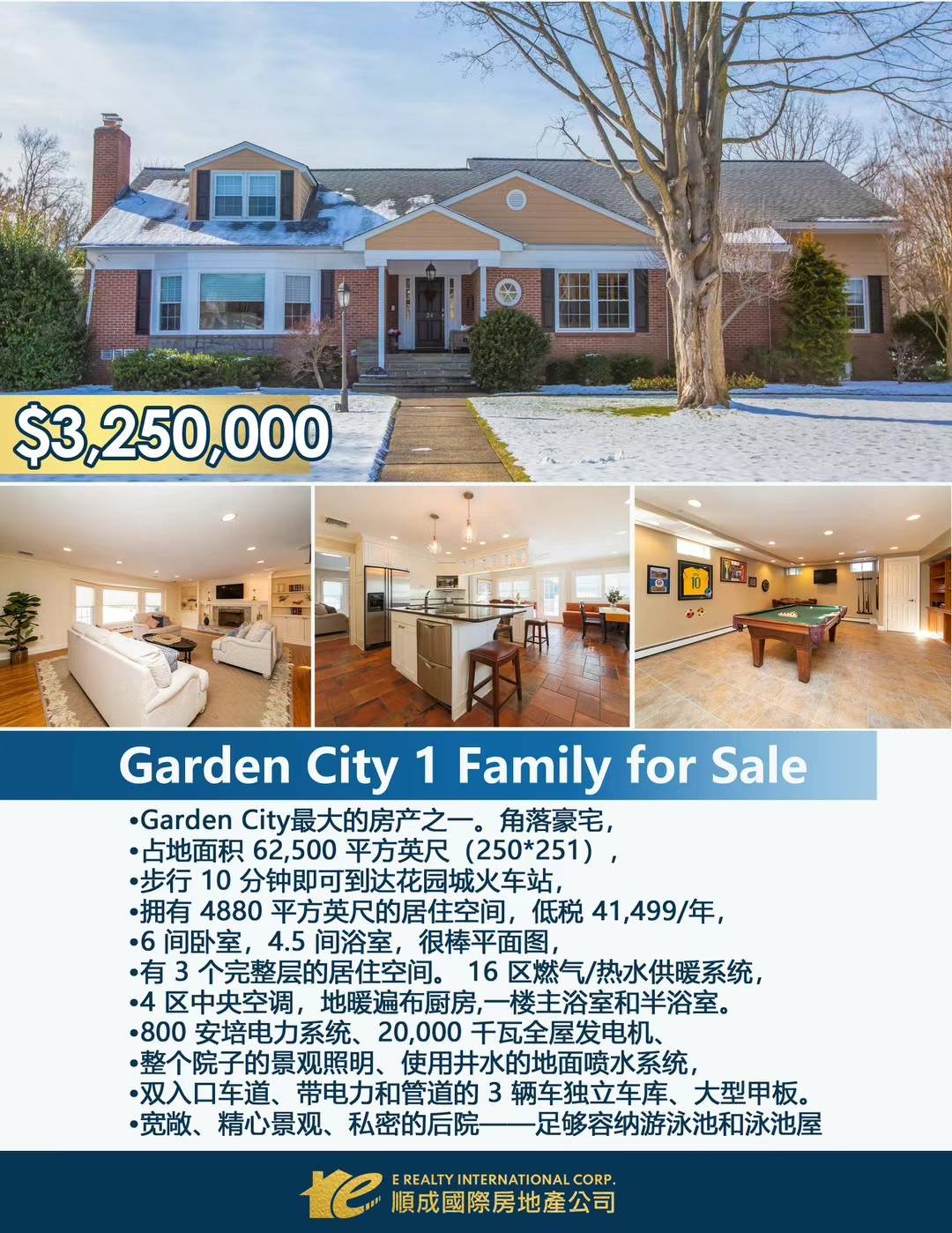 Garden City最大的房产之一。角落豪宅·占地面积 62,500 平方英尺 (250*251)·步行10 分钟即可到达长岛火车站🚉,·拥有 4886 平方英尺的居住空间,低税 41,499/年·6间卧室,4.5 间浴室,很棒平面图,·有3个完整层的居住空间。16区燃气/热水供暖系统·4区中央空调,地暖遍布厨房,一楼主浴室和半浴室。·800安培电力系统、20,000 千瓦全屋发电机、·整个院子的景观照明、使用井水的地面喷水系统,双入口车道、带电力和管道的3辆车独立车库、大型甲板。·宽敞、精心景观、私密的后院一一足够容纳游泳池和泳池