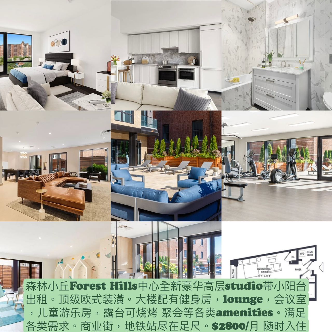 全新豪华高层studio带小阳台出租。顶级欧式装潢。大楼配有健身房,lounge,会议室,儿童游乐房,露台可烧烤 聚会等各类amenities。满足各类需求。商业街,地铁站尽在足尺。$2800/月 随时入住