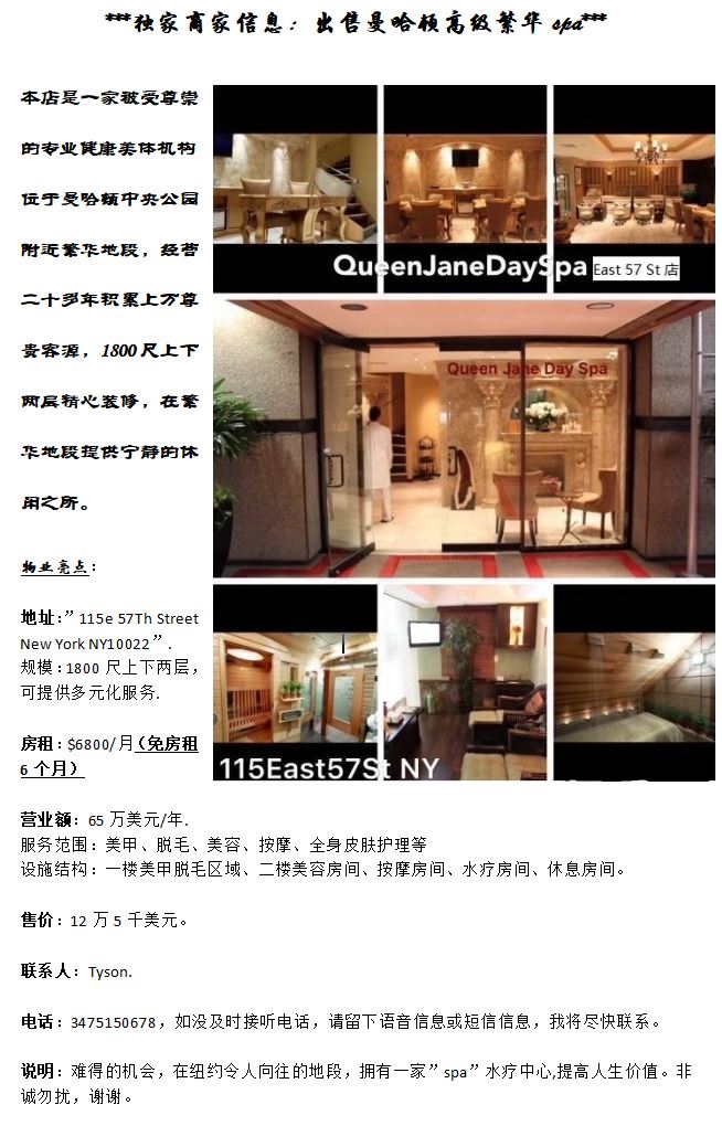 本店是一家被受尊崇的专业健康美体机构,位于曼哈顿中央公园附近繁华地段,经营二十多年积累上万尊贵客源,1800尺上下两层精心装修,在繁华地段提供宁静的休闲之所。 物业亮点: 地址:”115e 57Th Street New York NY10022”. 规模:1800尺上下两层,可提供多元化服务. 房租:$6800/月(免房租6个月) 营业额:65万美元/年. 服务范围:美甲、脱毛、美容、按摩、全身皮肤护理等 设施结构:一楼美甲脱毛区域、二楼美容房间、按摩房间、水疗房间、休息房间。 售价:12万5千美元。 联系人:Tyson. 电话:Tyson8,请说明在网上看到的,如没及时接听电话,请留下语音信息或短信信息,我将尽快联系。 说明:难得的机会,在纽约令人向往的地段,拥有一家”spa”水疗中心,提高人生价值。非诚勿扰, 谢谢。