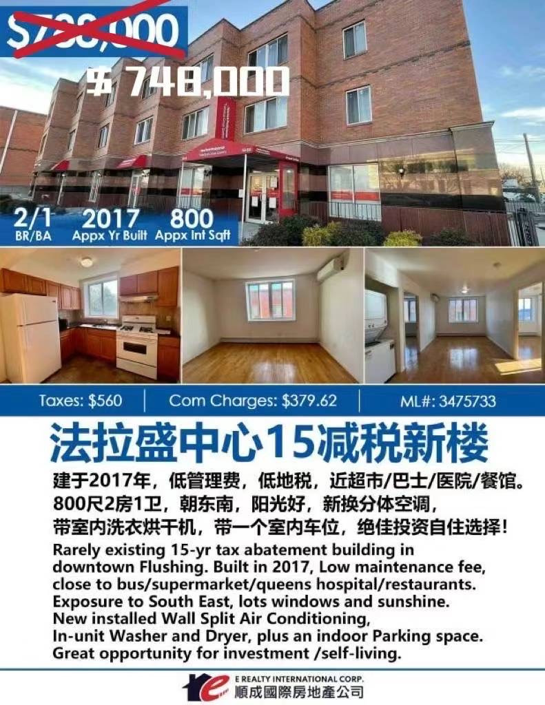 🔥新上市出售法拉盛中心新楼,近皇后医院,还有8年减地税,低管理费,低地税,近超市/巴士/医院/餐馆。800尺2房1卫,朝东南,阳光好,新换分体空调,带室内洗衣烘干机,带一个室内车位,带租客租金$2500/月
