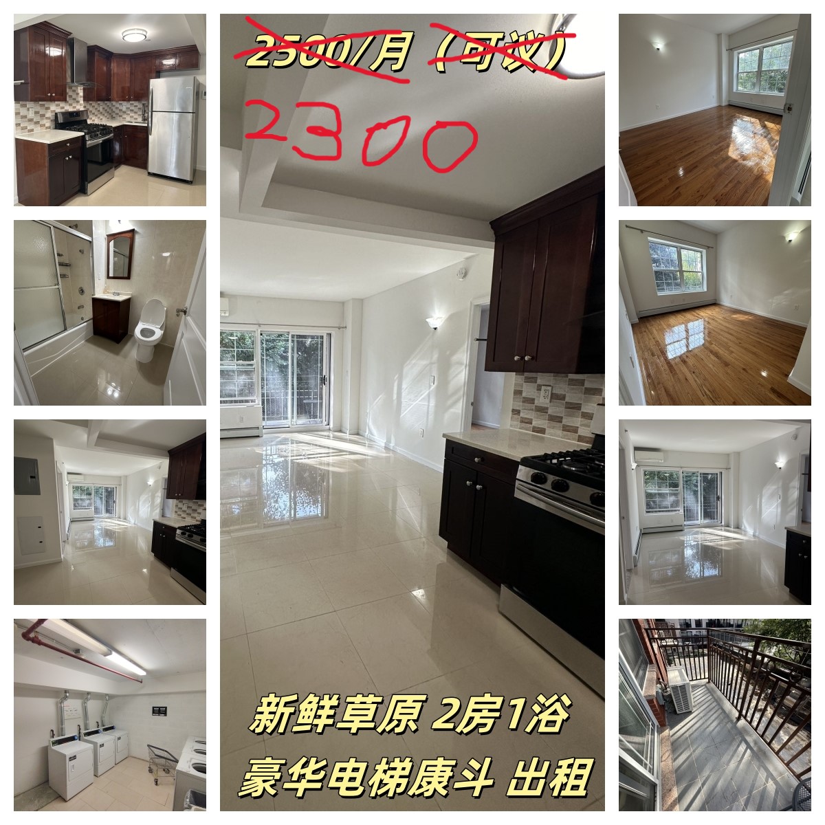新装修 大2房1浴,租金2300/月包水 分体式空调,