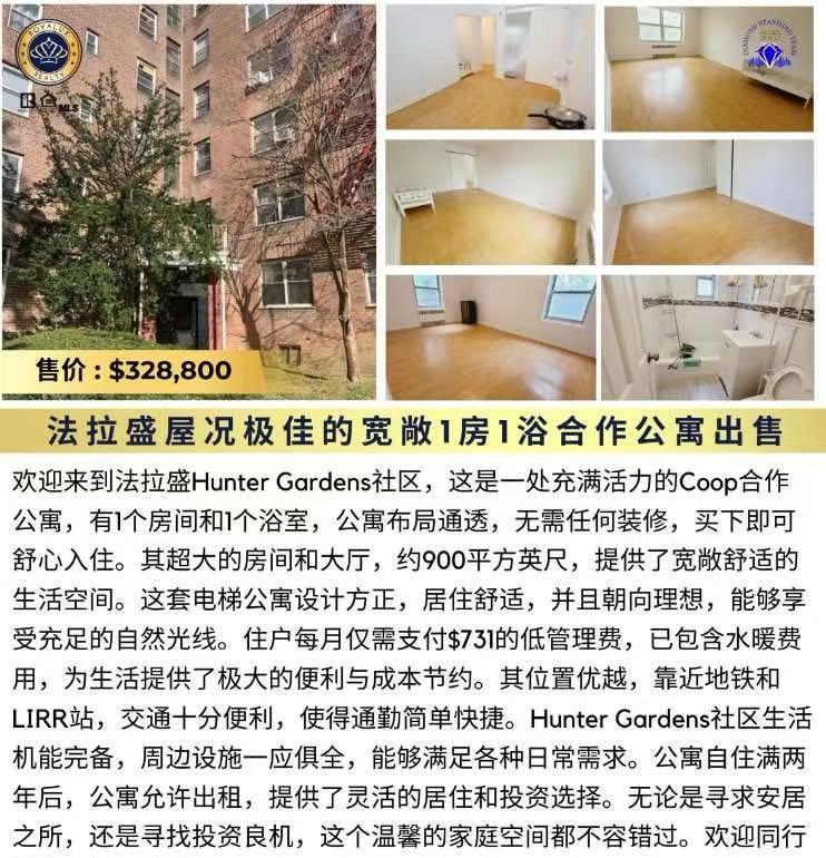 欢迎来到法拉盛Hunter Gardens社区,这是一处充满活力的Coop合作公寓,有1个房间和1个浴室,公寓布局通透,无需任何装修,买下即可舒心入住。其超大的房间和大厅,约900平方英尺,提供了宽敞舒适的生活空间。这套电梯公寓设计方正,居住舒适,并且朝向理想,能够享受充足的自然光线。住户每月仅需支付$731的低管理费,已包含水暖费用,为生活提供了极大的便利与成本节约。其位置优越,靠近地铁和LIRR站,交通十分便利,使得通勤简单快捷。Hunter Gardens社区生活机能完备,周边设施一应俱全,能够满足各种日常需求。公寓自住满两年后,公寓允许出租,提供了灵活的居住和投资选择。无论是寻求安居之所,还是寻找投资良机,这个温馨的家庭空间都不容错过。