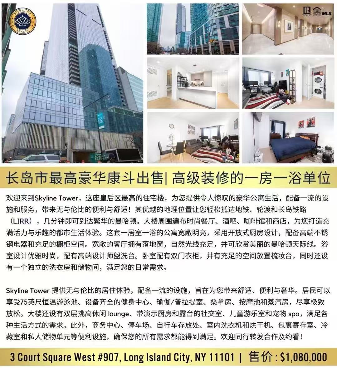 Skyline Tower 提供无与伦比的居住体验,配备一流的设施,旨在为您带来舒适、便利与奢华。居民可以享受75英尺恒温游泳池、设备齐全的健身中心、瑜伽/普拉提室、桑拿房、按摩池和蒸汽房,尽享极致放松。大楼还设有双层挑高休闲 lounge、带演示厨房和露台的社交室、儿童游乐室和宠物 spa,满足各种生活方式的需求。此外,商务中心、停车场、自行车存放处、室内洗衣机和烘干机、包裹寄存室、冷藏室和私人储物单元等便利设施,确保您的所有需求都能得到满足。欢迎买家!