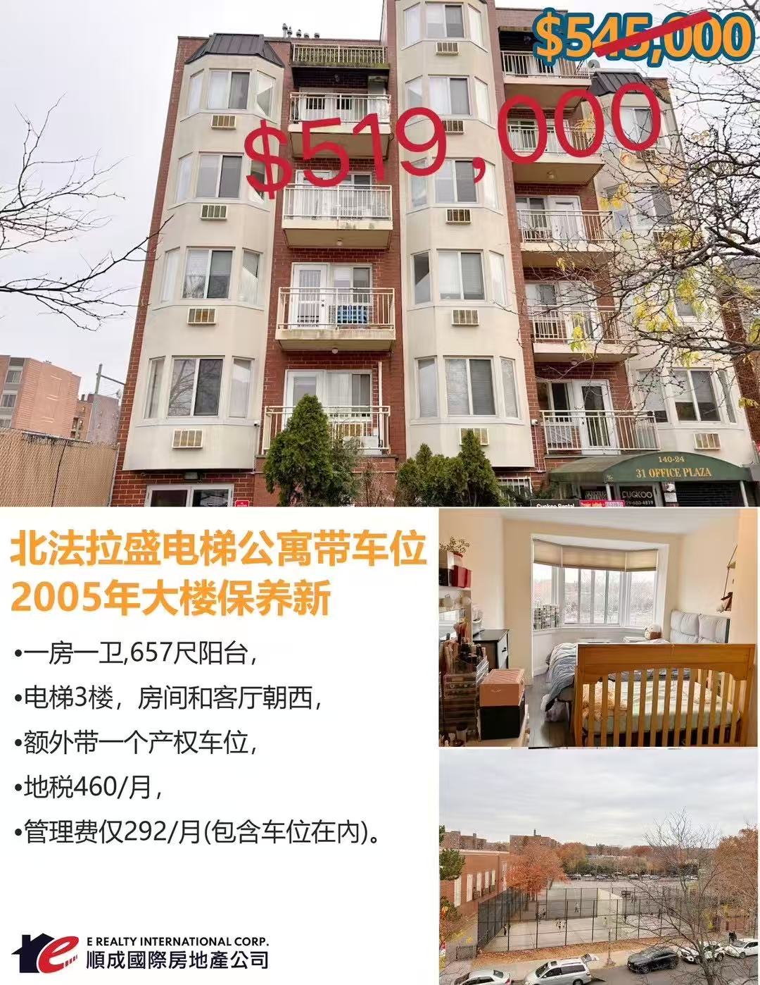 一房一卫,657尺阳台,电梯3楼,房间和客厅朝西,额外带一个产权车位,地税460/月,管理费仅292/月(包含车位在內)。楼下公交车站,周边图书馆超市应有尽有,大楼对面小学Ps214.