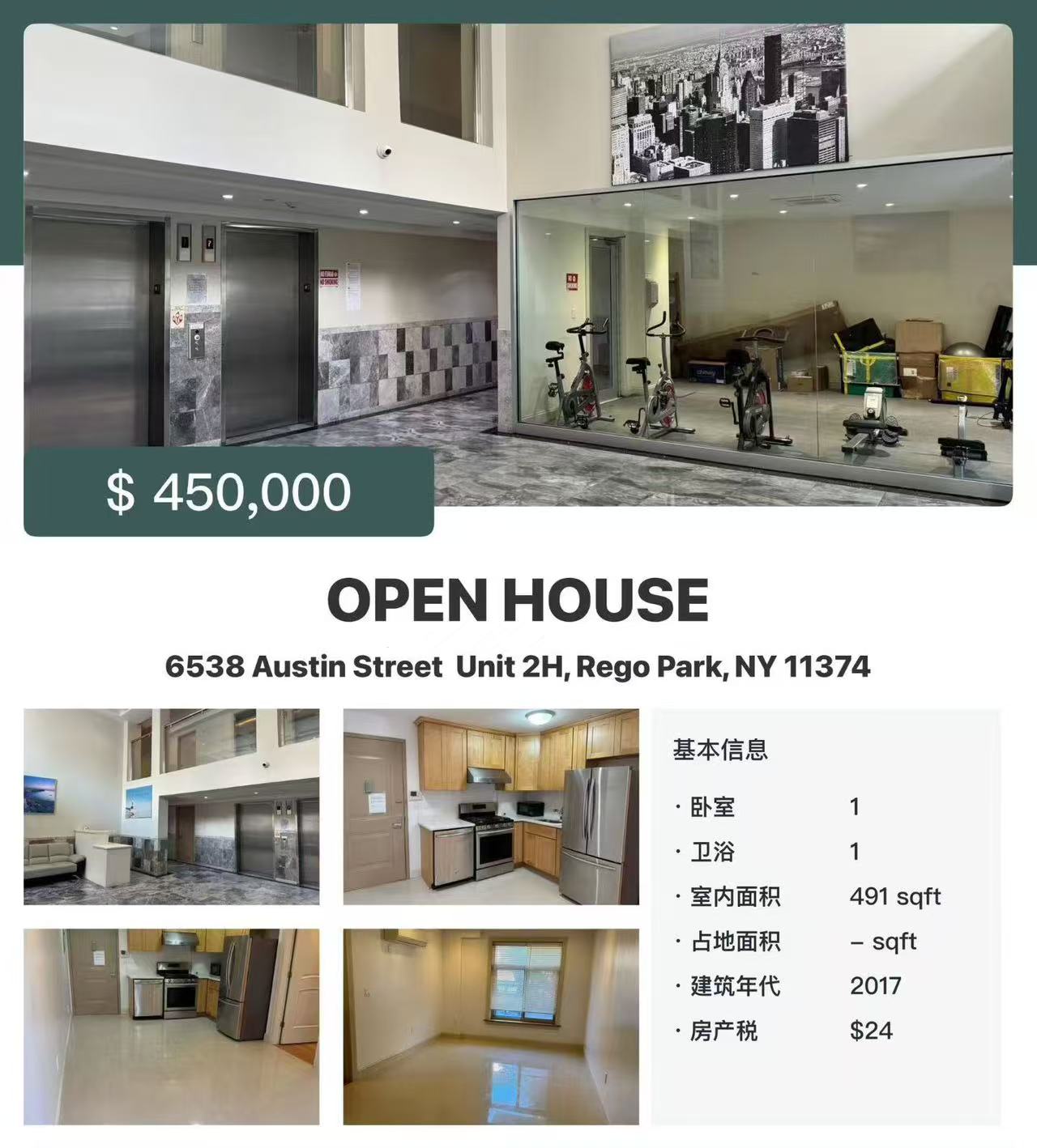 🍀新上市Rego Park现代化装修1房1浴电梯康斗