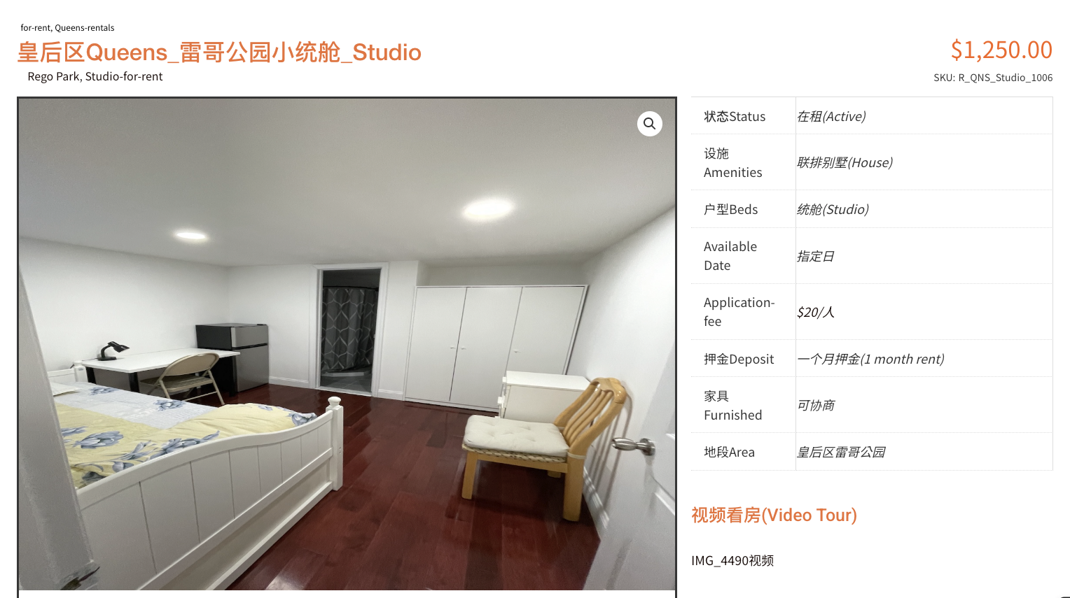 1️⃣ 皇后区 Queens – 雷哥公园小统舱:$1250/月